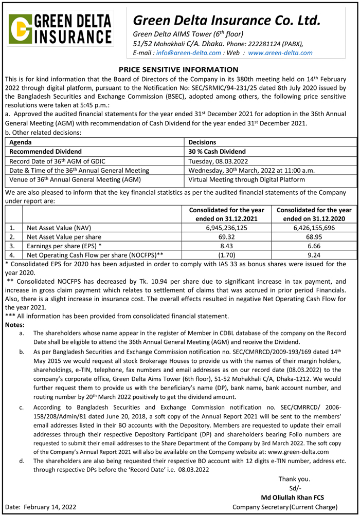 Price Sensitive Information Of Green Delta Insurance Co. Ltd.