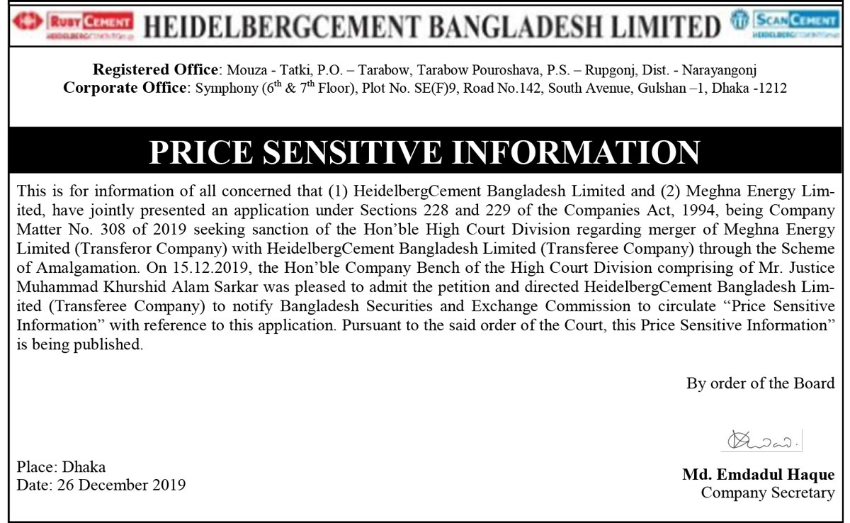 Price Sensitive Information of HeidelbergCement Bangladesh Limited