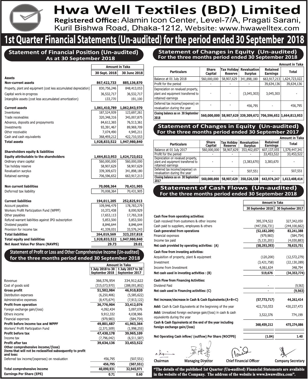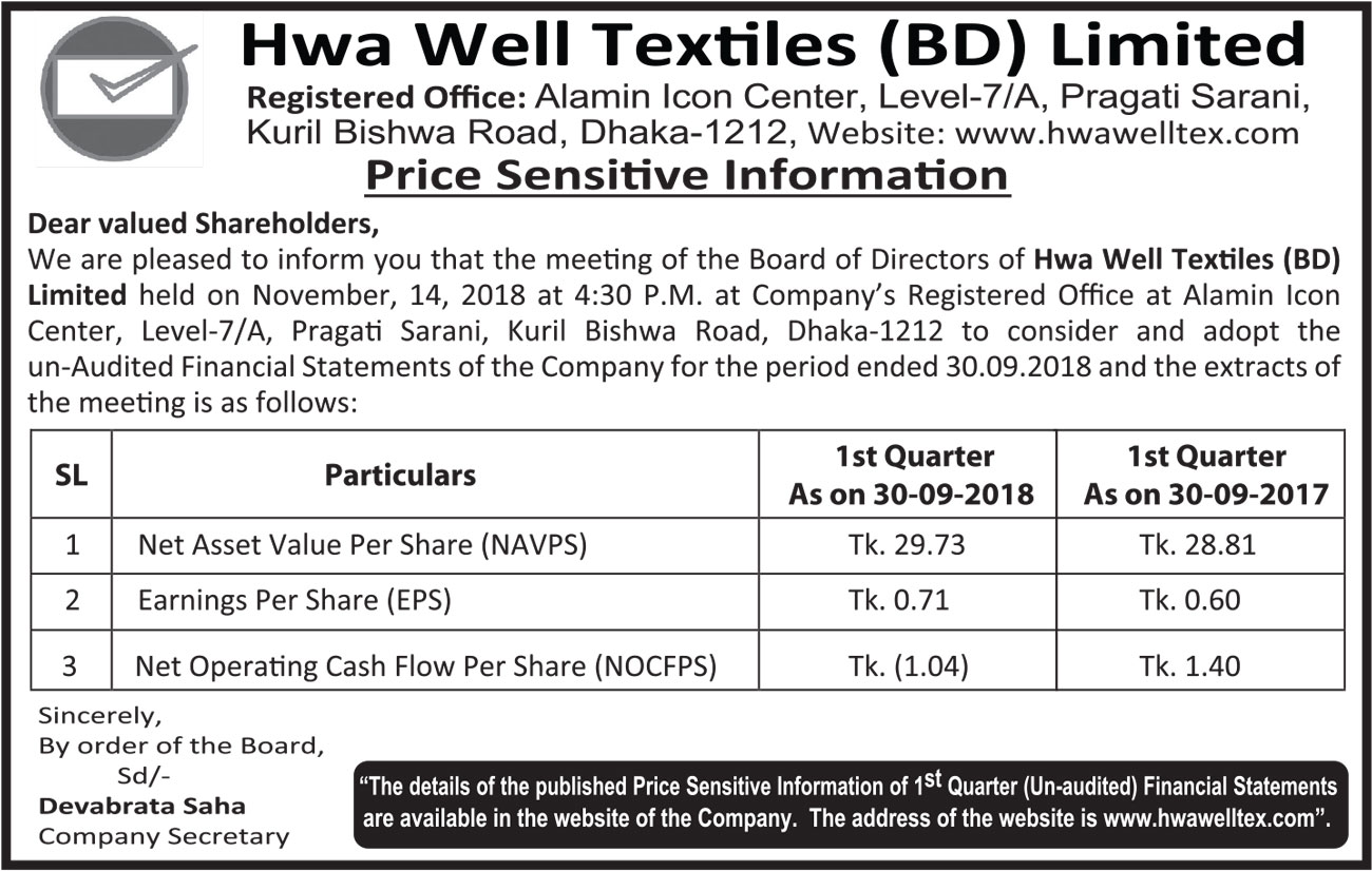 Price Sensitive Information (Q1) of Hwa Well Textiles (BD) PLC.