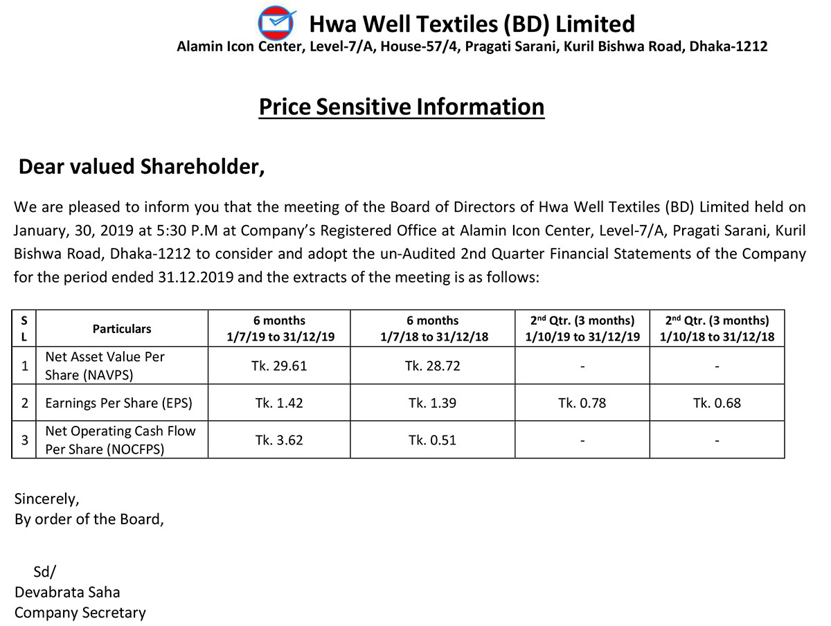 Price Sensitive Information Of Hwa Well Textiles (BD) Limited