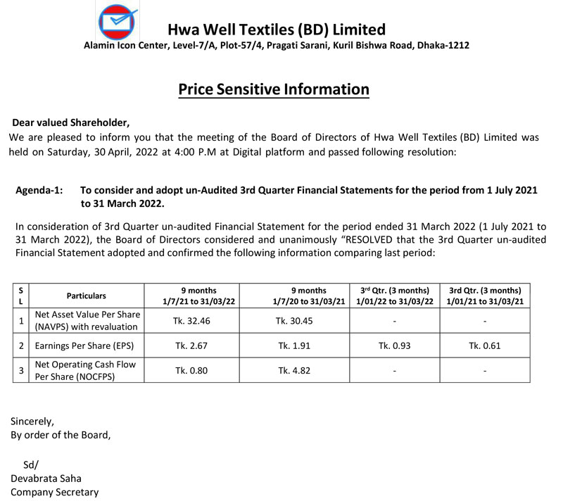 Price Sensitive Information of Hwa Well Textiles (BD) Limited