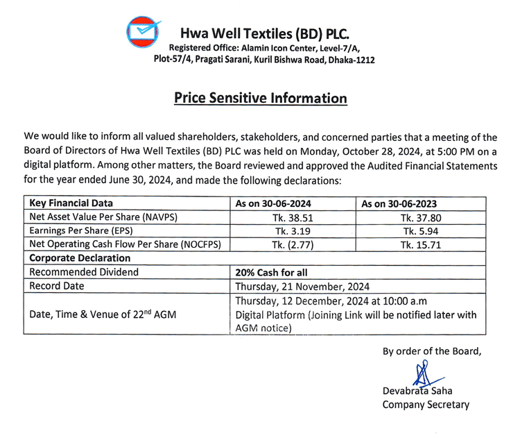 Price Sensitive Information of Hwa Well Textiles (BD) Limited