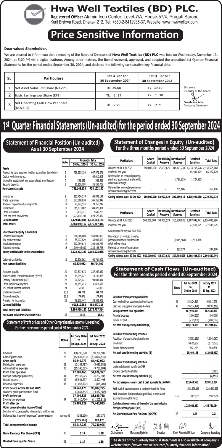 Price Sensitive Information (Q1) of Hwa Well Textiles (BD) PLC.