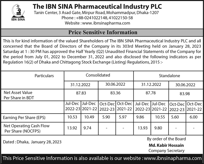 Price Sensitive Information of The IBN SINA Pharmaceuticals Industry PLC