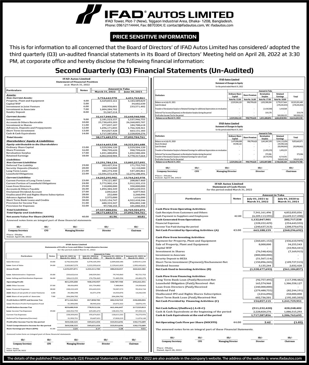 Price Sensitive Information (Q3) of IFAD Autos PLC