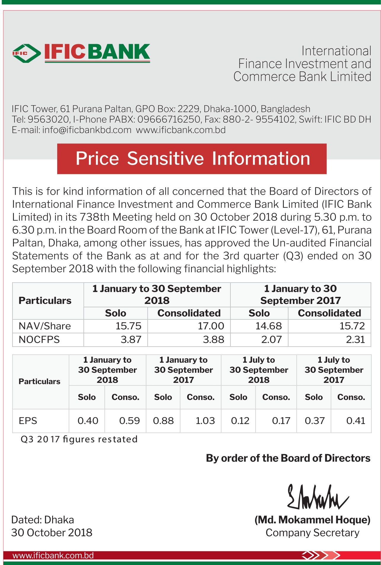 Price Sensitive Information Of IFIC BANK