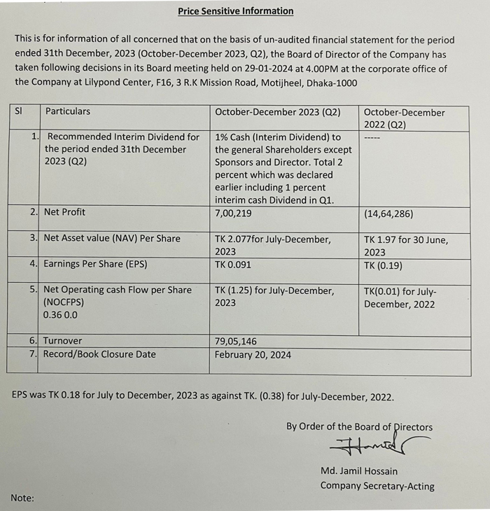 Q2 Financial Statements (Un-audited) of Imam Button Industries Ltd.