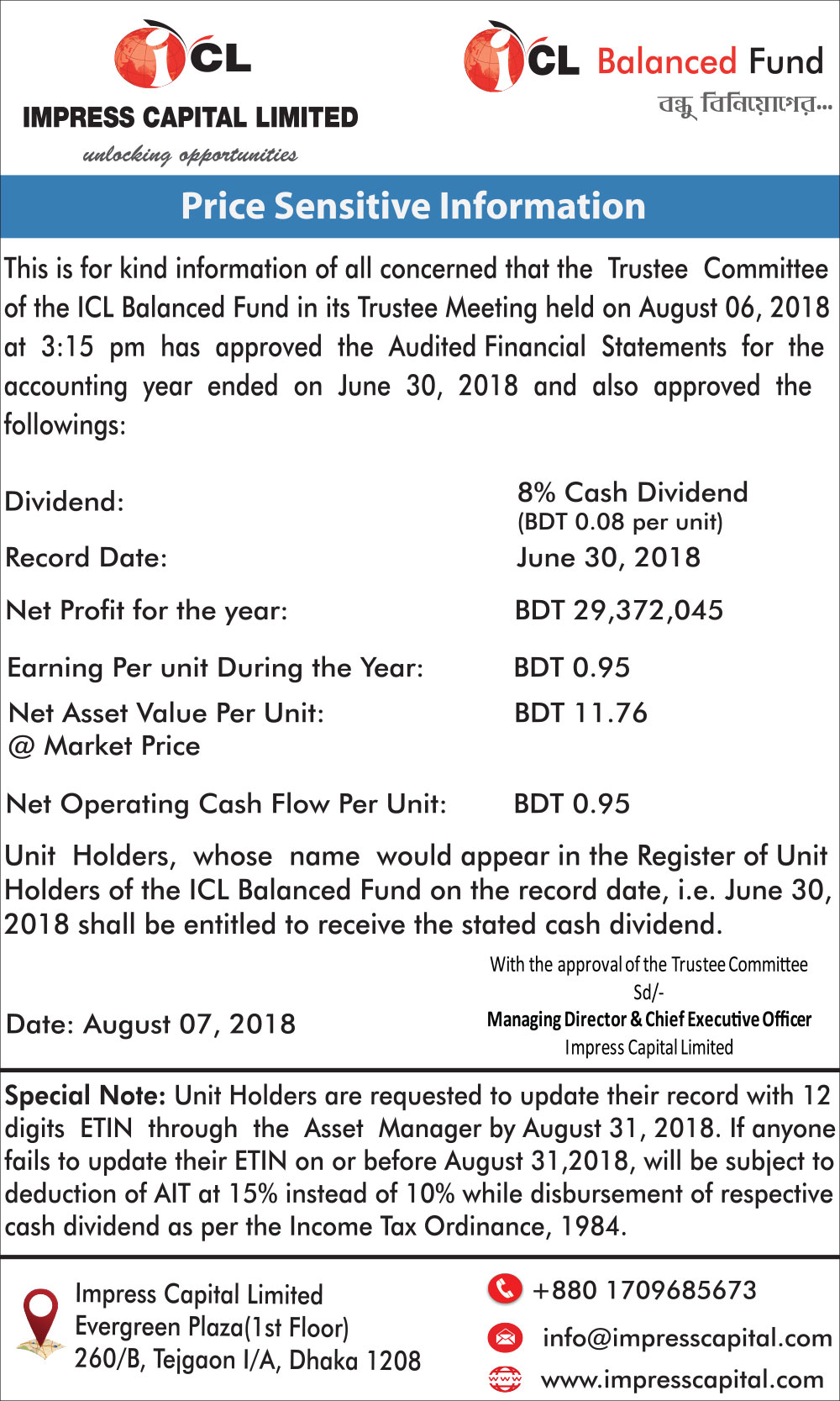 Price Sensitive Information of Impress Capital Limited