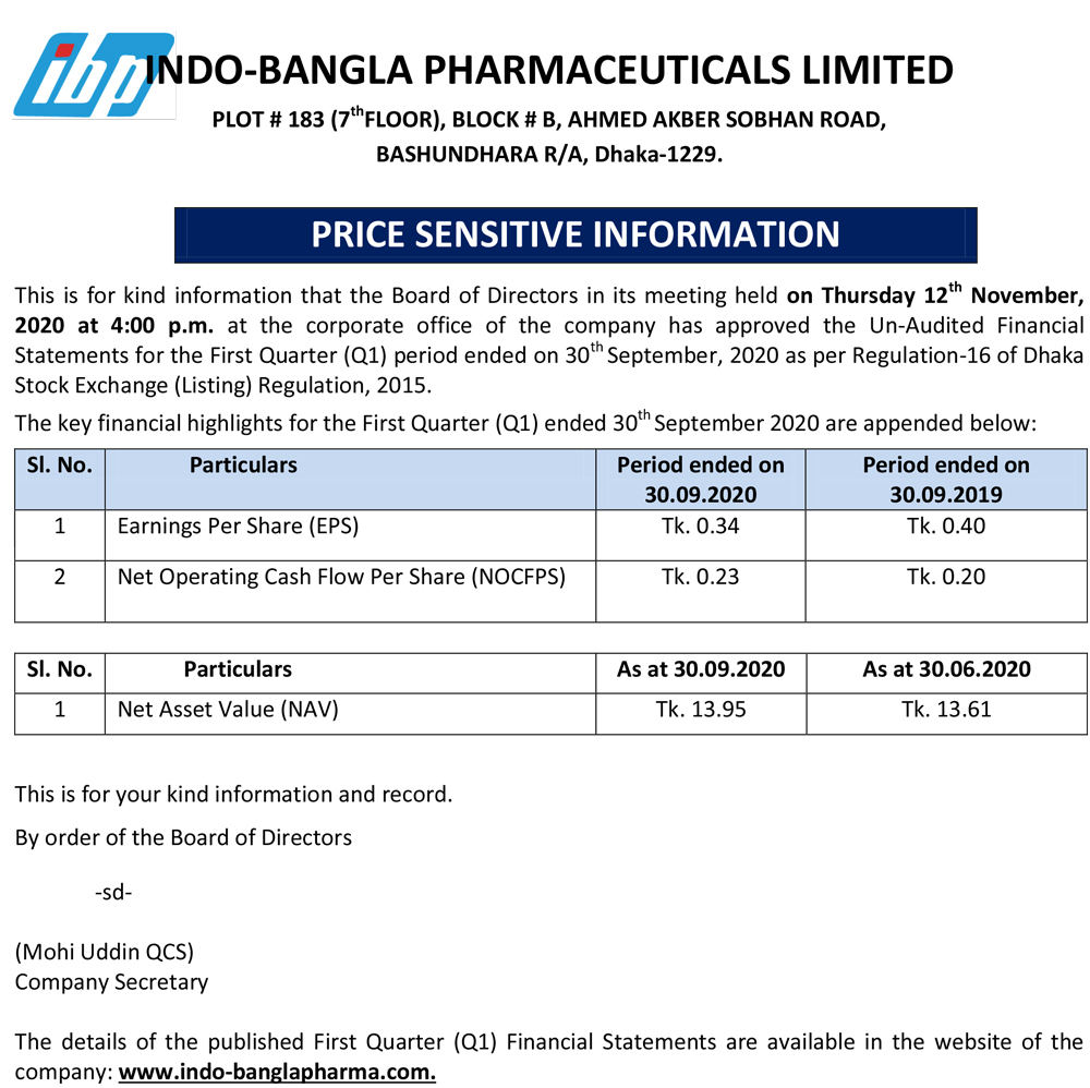 Price Sensitive Information of Indo-Bangla Pharmaceuticals Limited