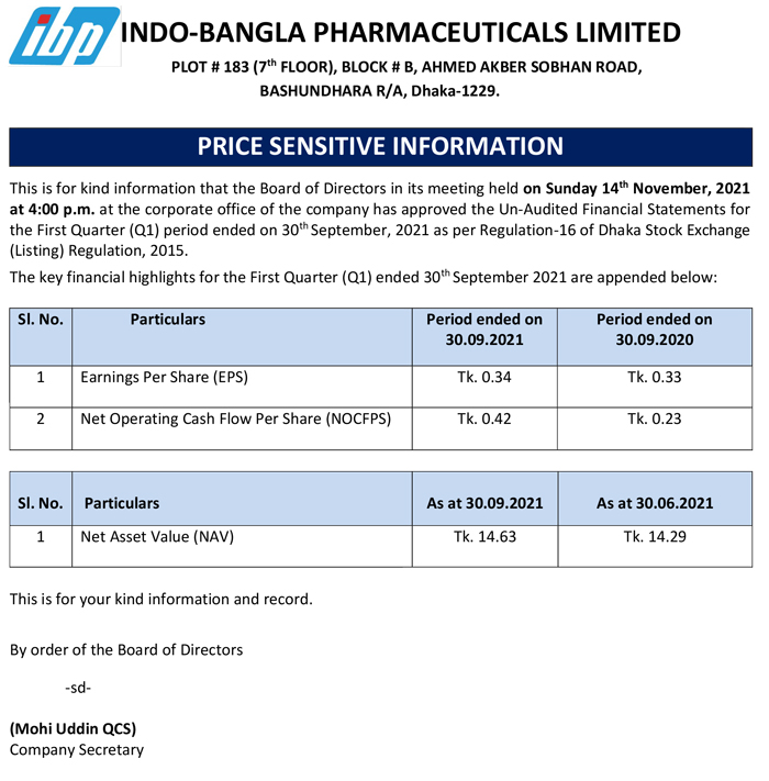 Price Sensitive Information of Indo-Bangla Pharmaceuticals Limited