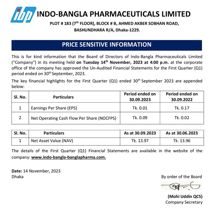 Price Sensitive Information of Indo-Bangla Pharmaceuticals Limited