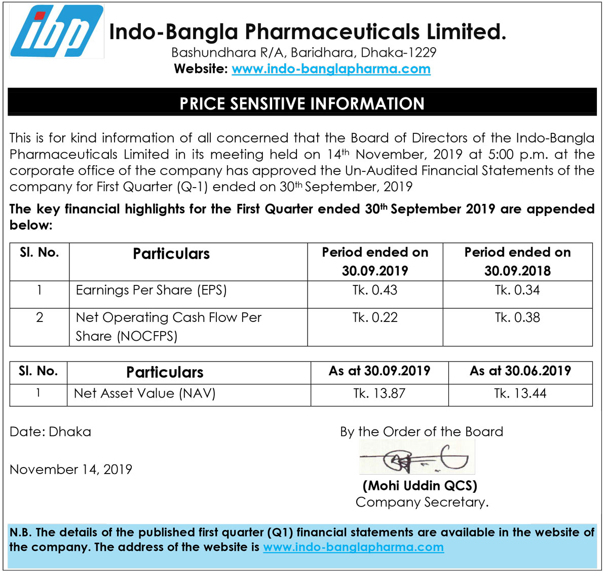Price Sensitive Information Of Indo-Bangla Pharmaceuticals limited