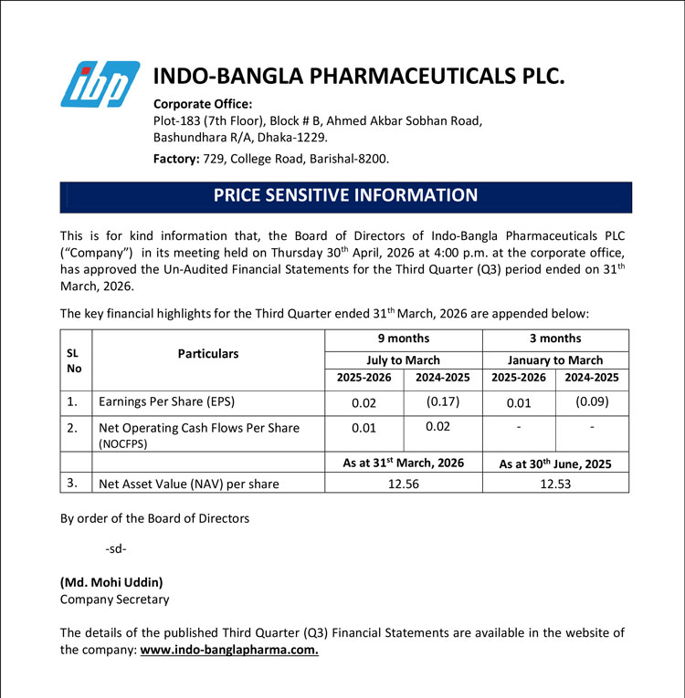 Price Sensitive Information of Indo-Bangla Pharmaceuticals Limited