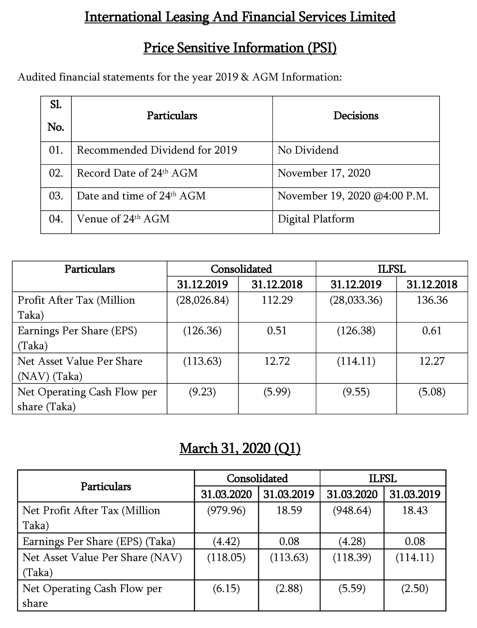 International Leasing and Financial Services Limited 1Q Price Sensitive Information