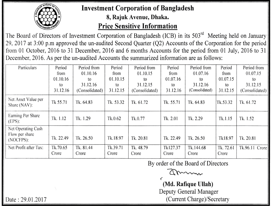 Price Sensitive Information of Investment Corporation of Bangladesh (ICB)