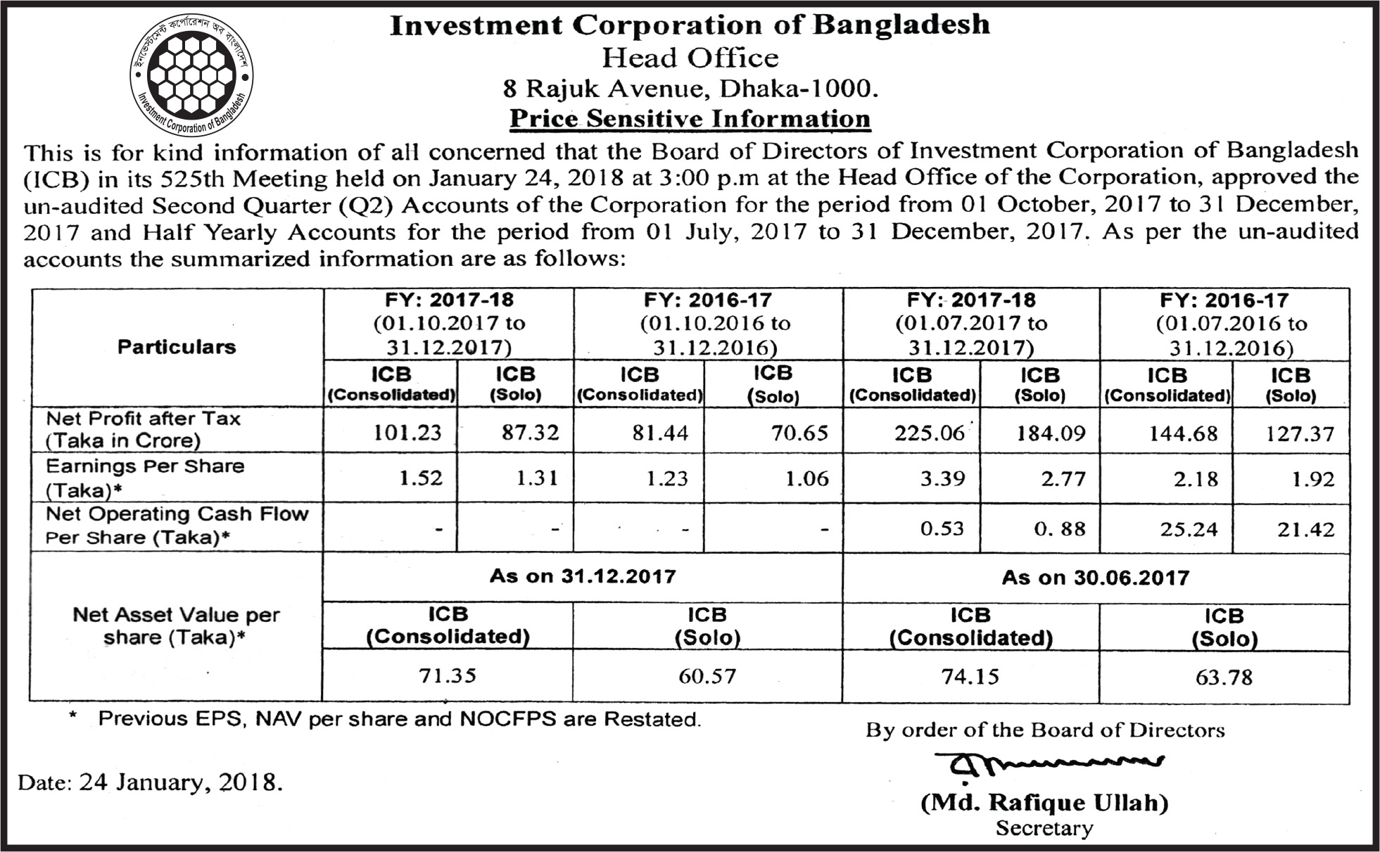 Price Sensitive Information of Investment Corporation of Bangladesh (ICB)