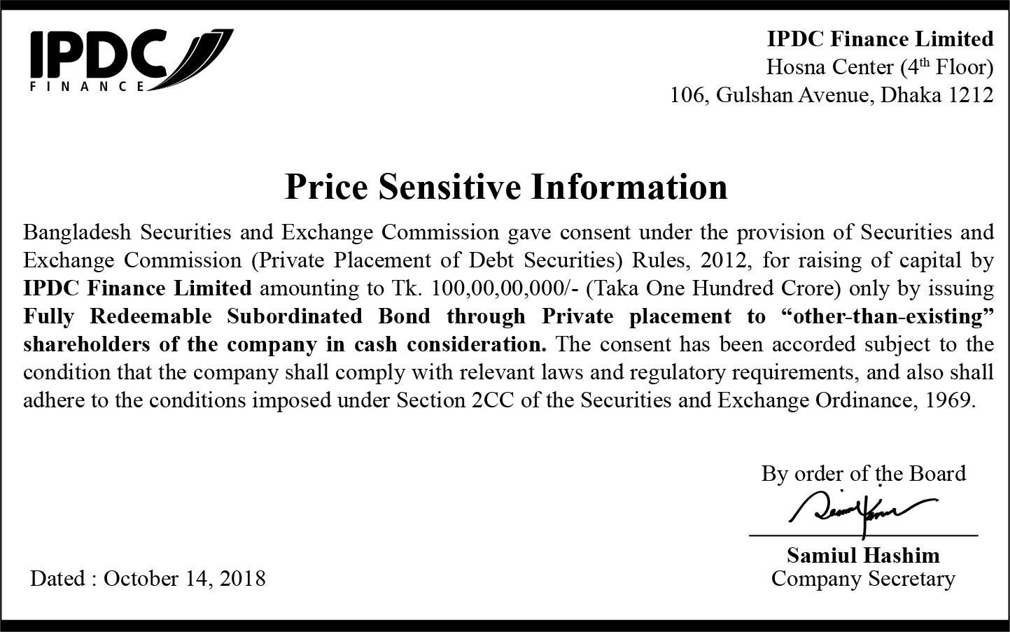 Price Sensitive Information (Non-convertible Subordinate Bond) of IPDC Finance Limited