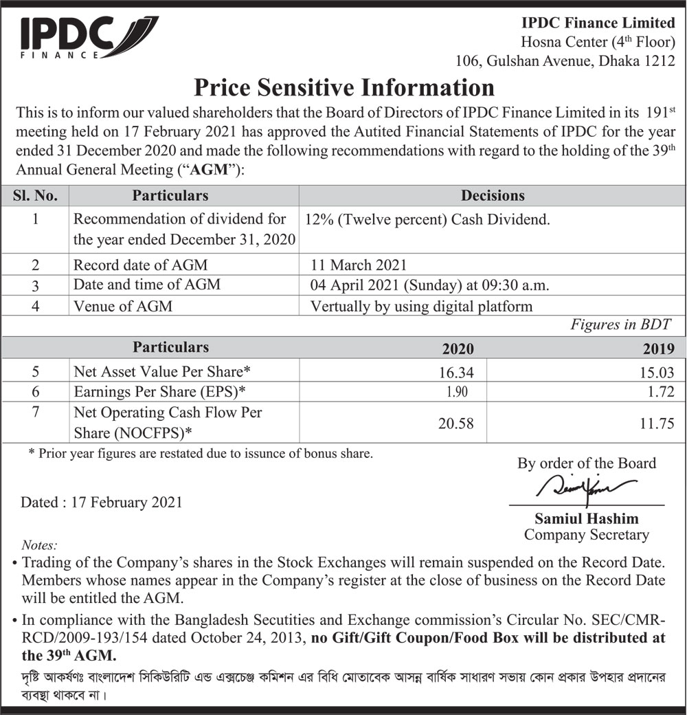 Price Sensitive Information of IPDC Finance Limited of year 2020 (Dividend Declaration)