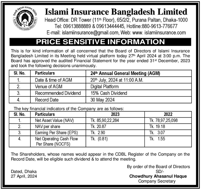 Price Sensitive Information of Islami Insurance Bangladesh Limited