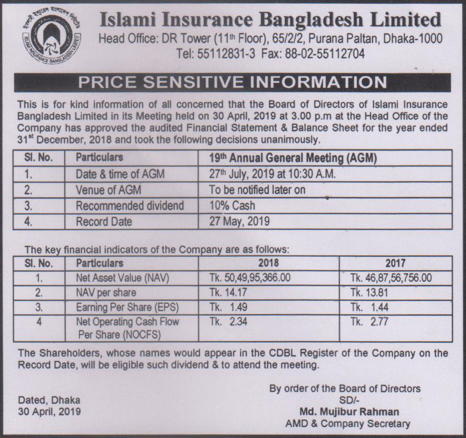 Price Sensitive Information of Islami Insurance Bangladesh Limited