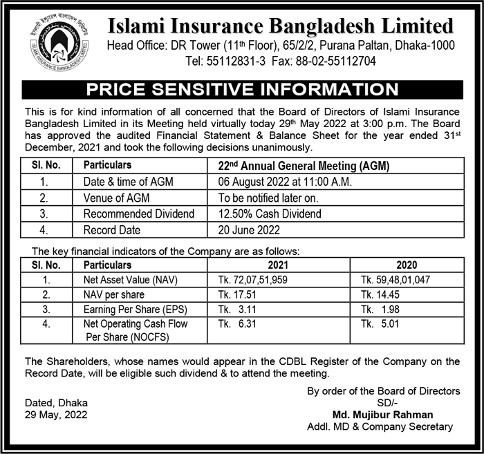Price Sensitive Information of Islami Insurance Bangladesh Limited