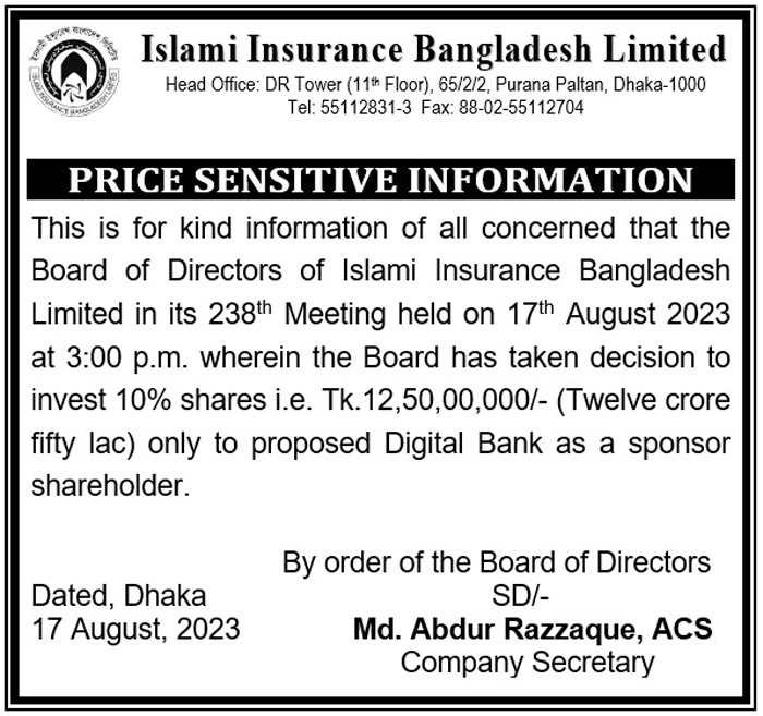Price Sensitive Information of Islami Insurance Bangladesh Limited