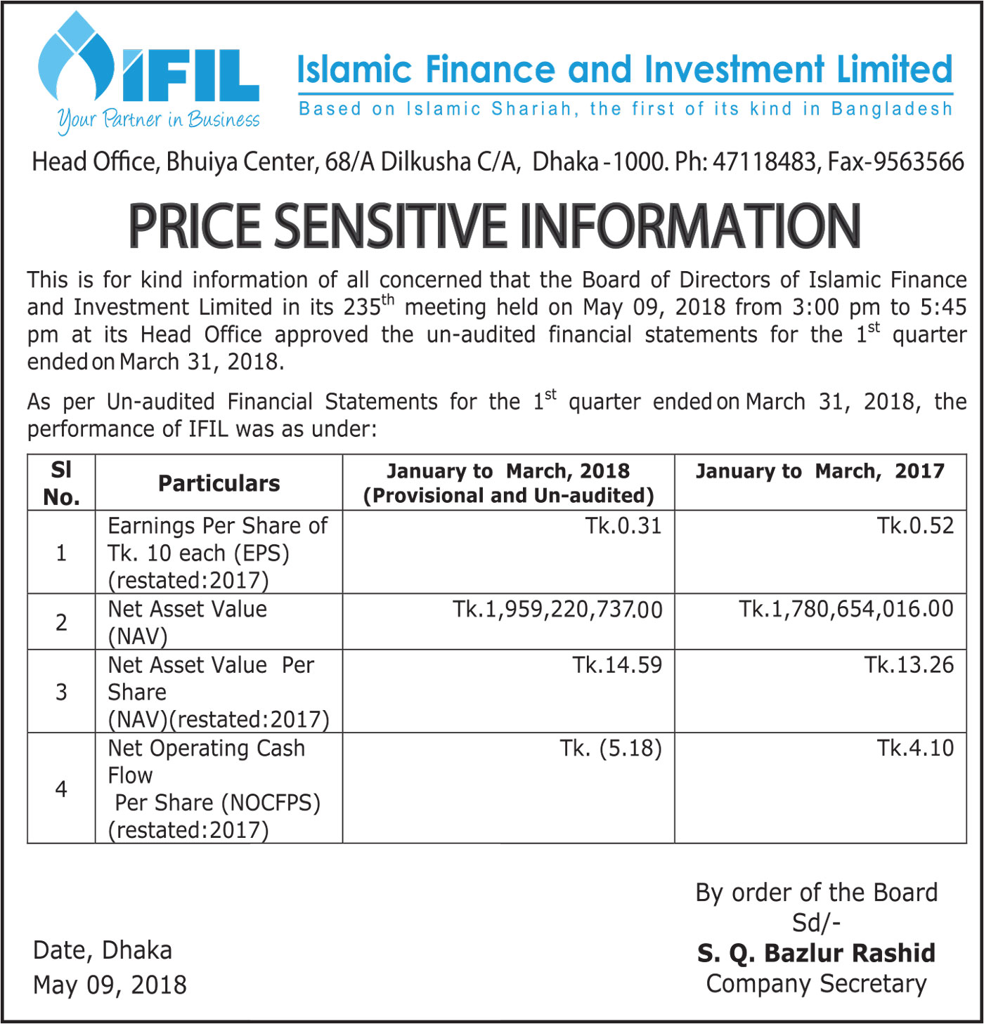Price Sensitive Information of Islamic Finance & Investment Ltd