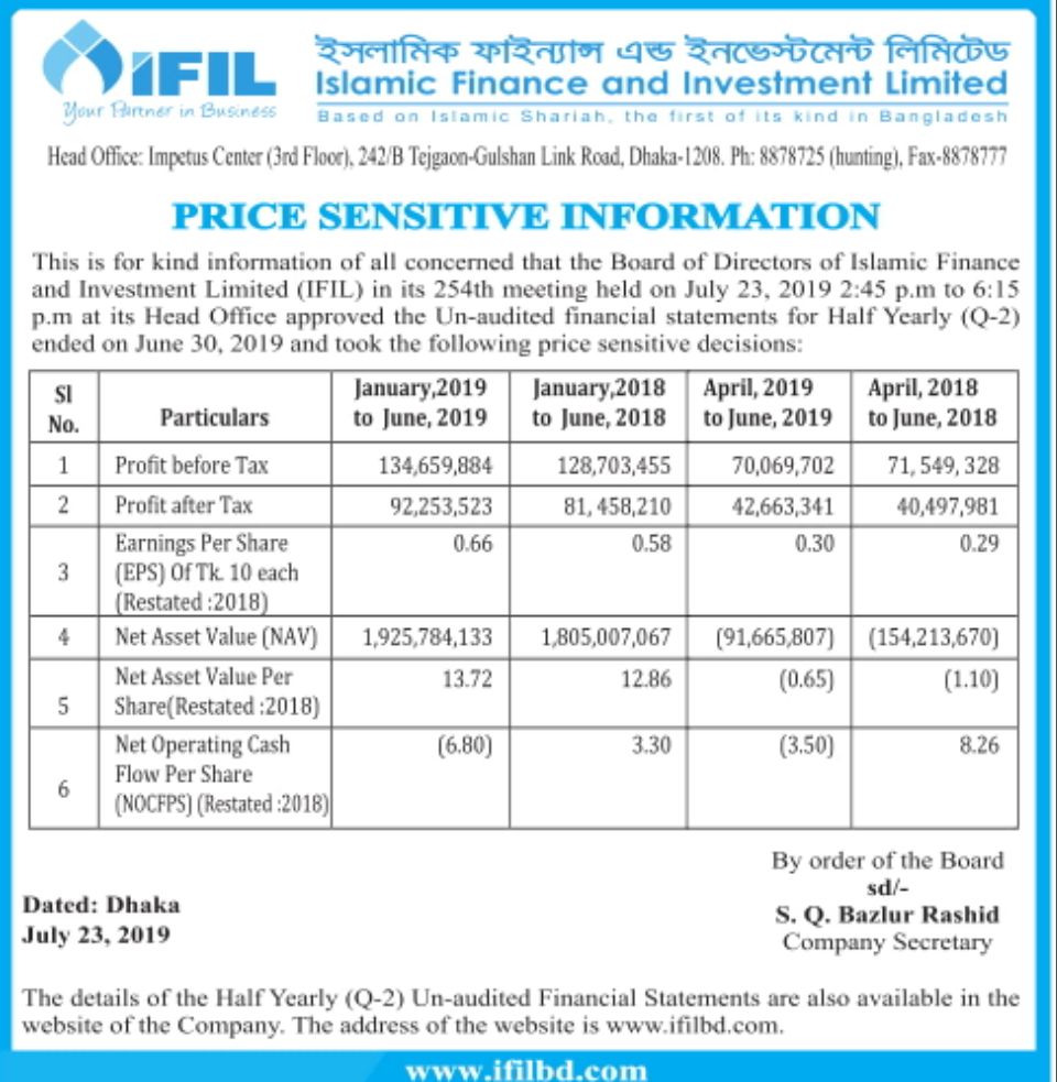 Price Sensitive Information of Islamic Finance and Investment Limited