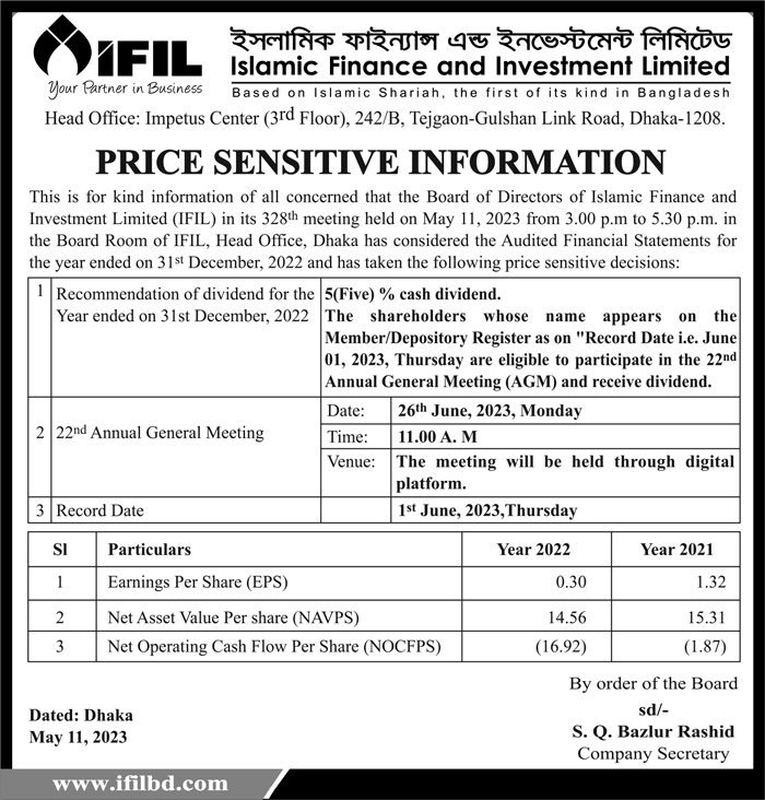 Price Sensitive Information of Islamic Finance & Investment Ltd