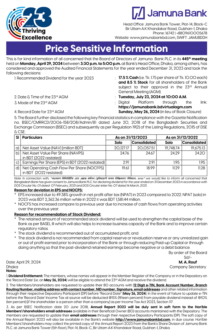 Information Sensitive to Share Price (Q2) of Jamuna Bank