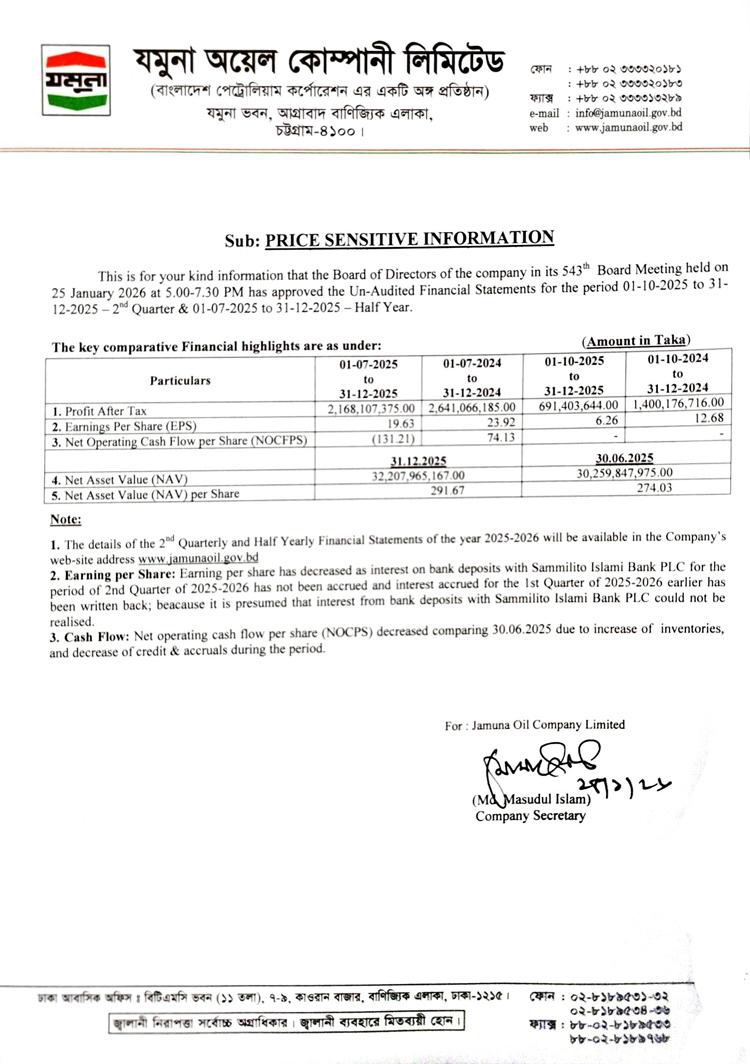 Price Sensitive Information Of Jamuna Oil Company Limited