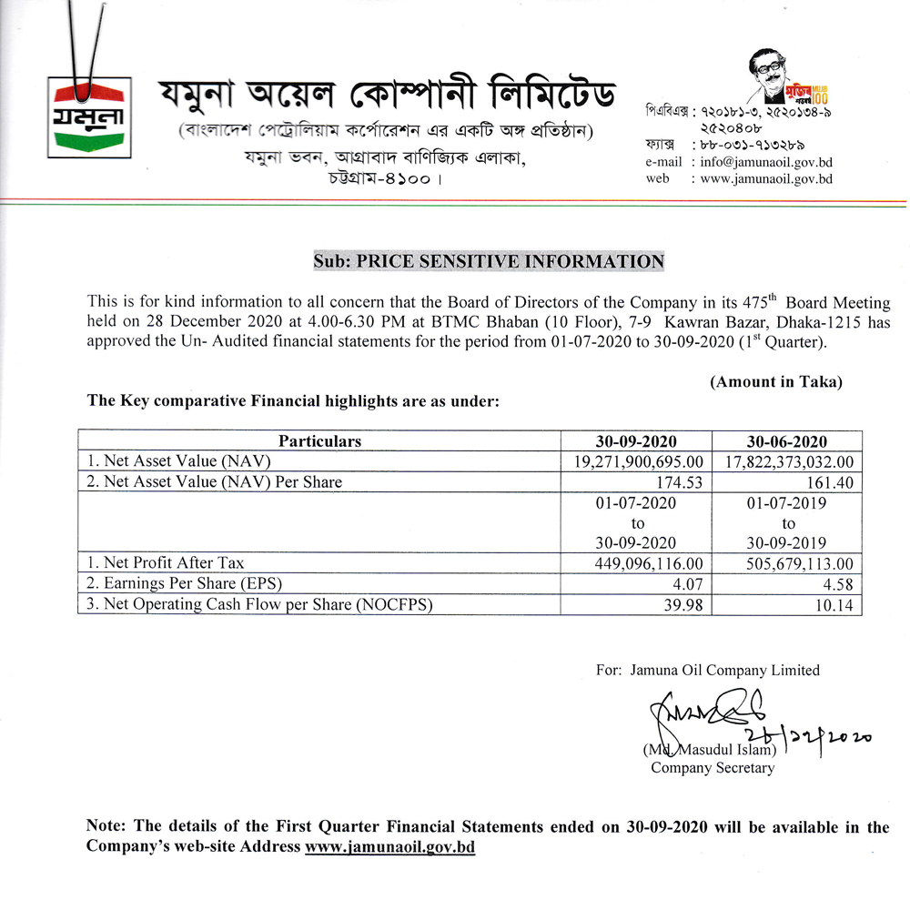 Price Sensitive Information Of Jamuna Oil Company Limited