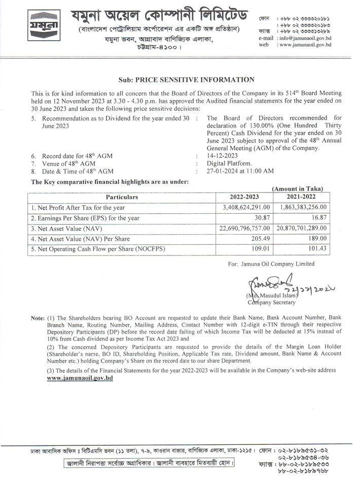 Price Sensitive Information of of Jamuna Oil Company Limited
