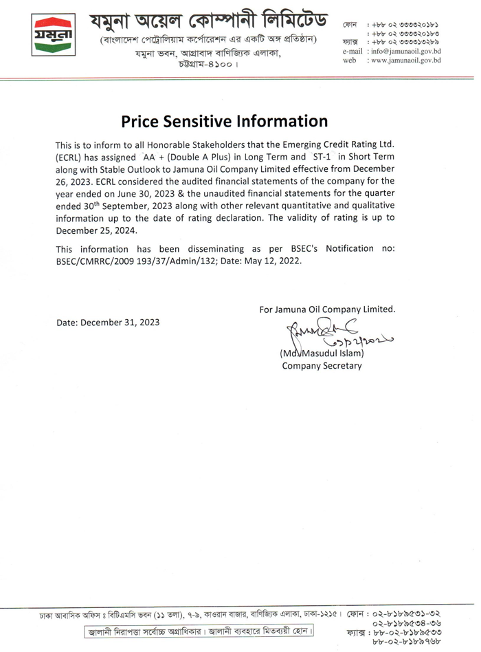 Price Sensitive Information Of Jamuna Oil Company Limited