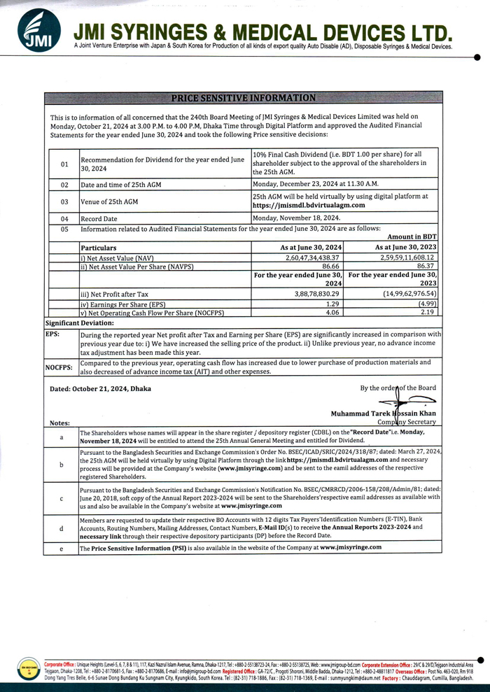 Price Sensitive Information of JMI Syringes & Medical Devices Ltd.