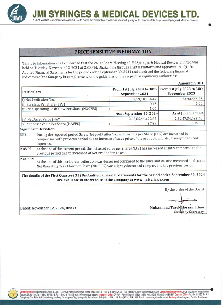 Price Sensitive Information of JMI Syringes & Medical Devices Ltd.