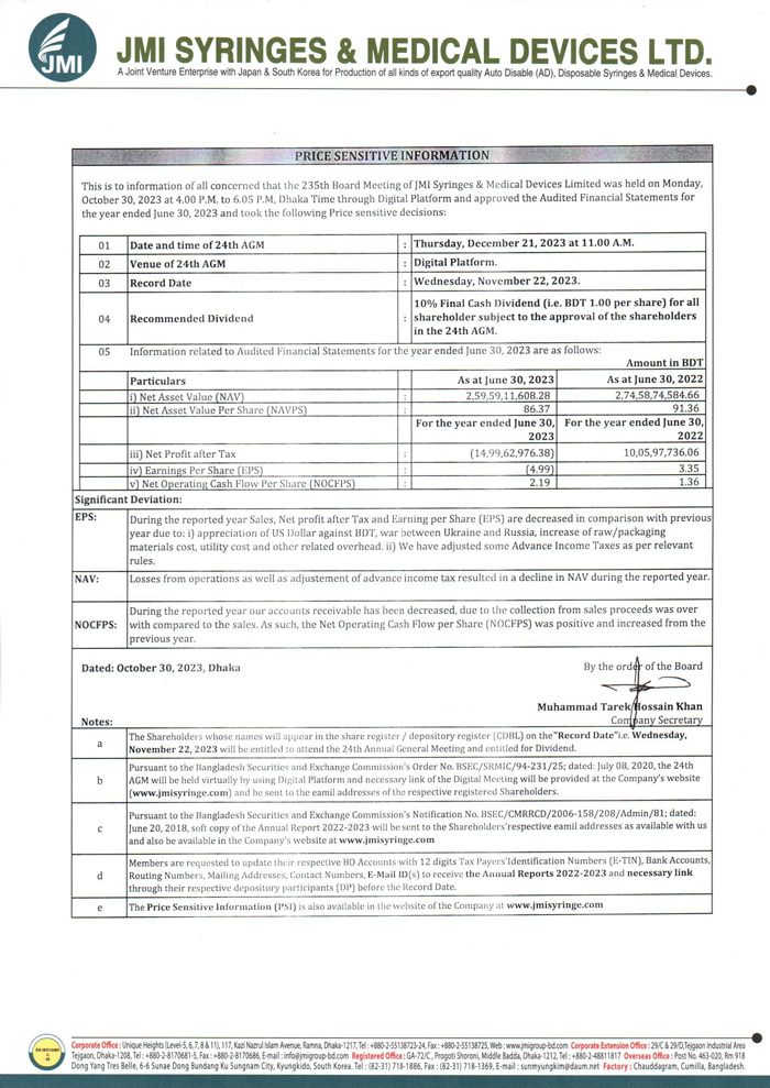 Information with Regard to Material Change/ Information of JMI Syringes & Medical Devices Ltd