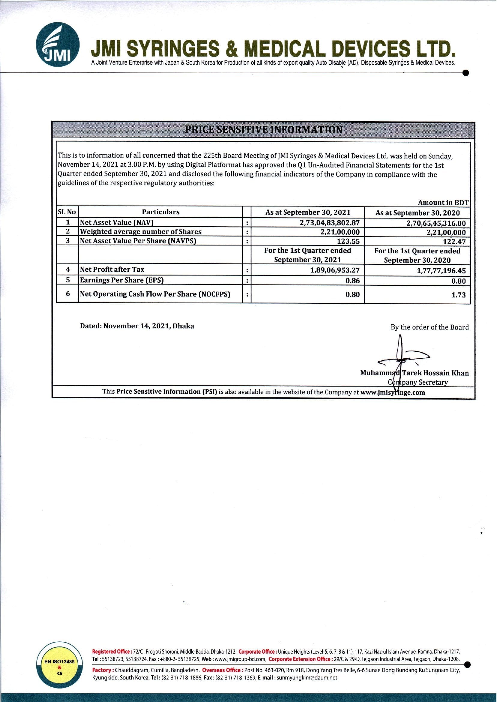 Price Sensitive Information of JMI Syringes & Medical Devices Ltd.