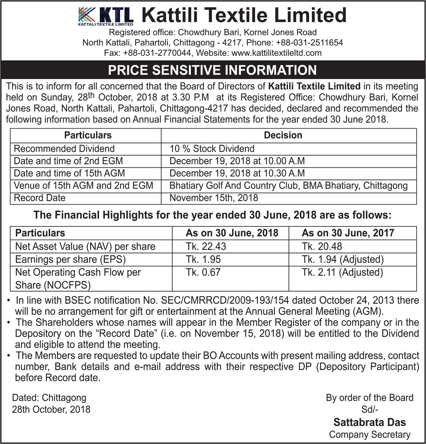Price Sensitive Information of Kattali Textile Limited