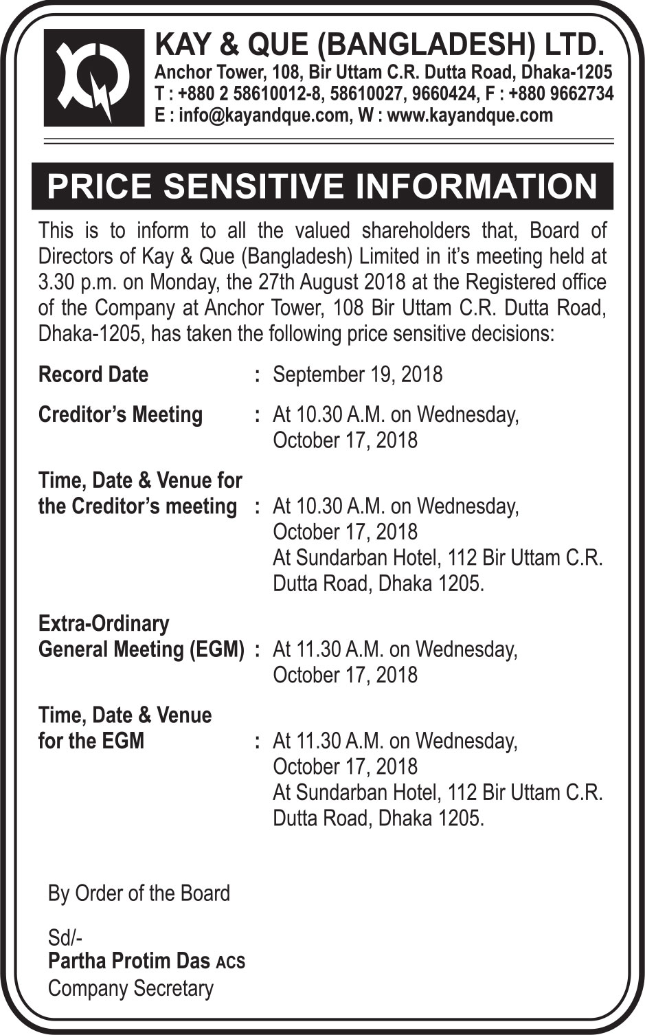 Kay & Que (Bangladesh) Price Sensitive Information