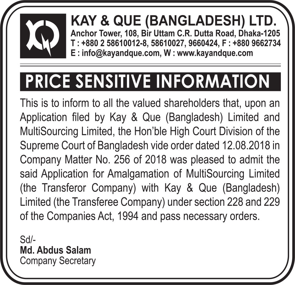 Kay and Que (Bangladesh) Limited Price Sensitive Information