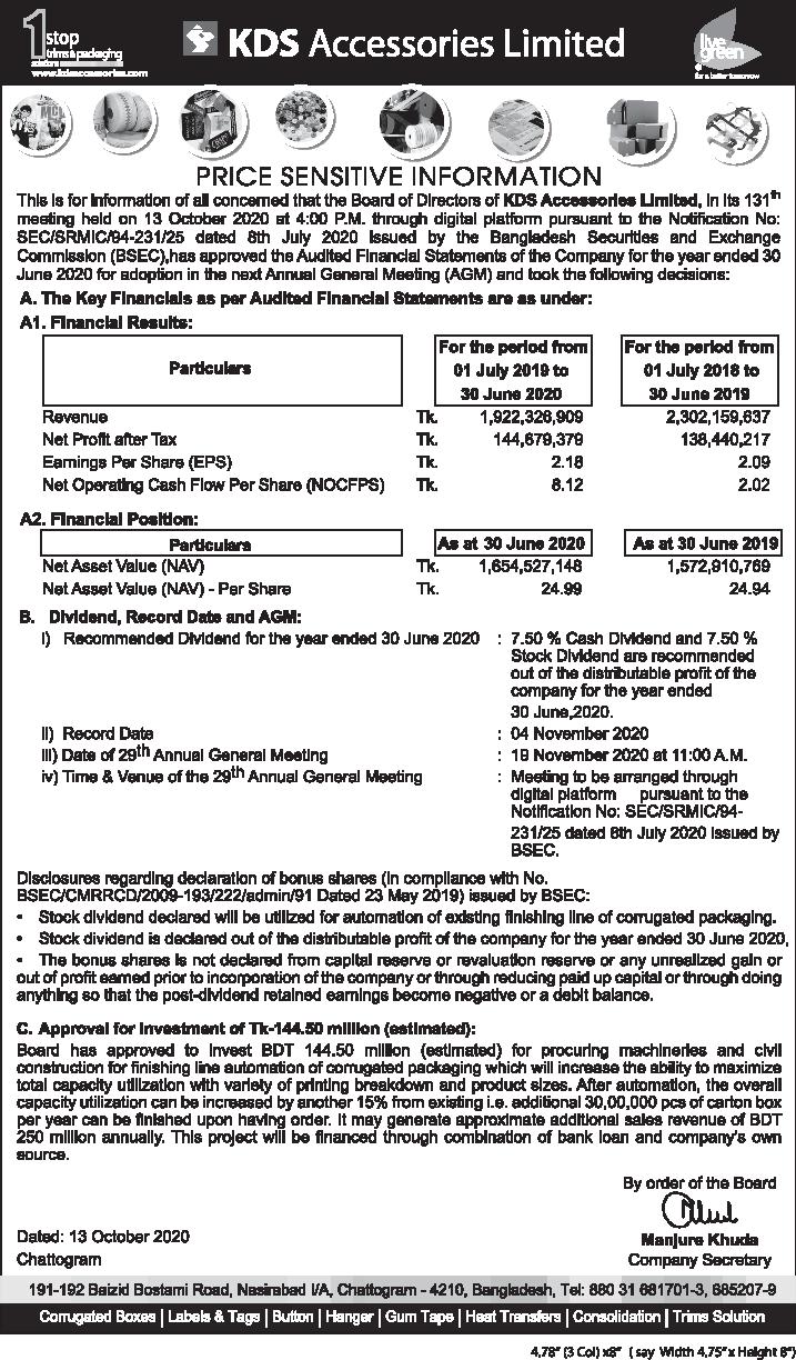 Price Sensitive Information of KDS Accessories Limited