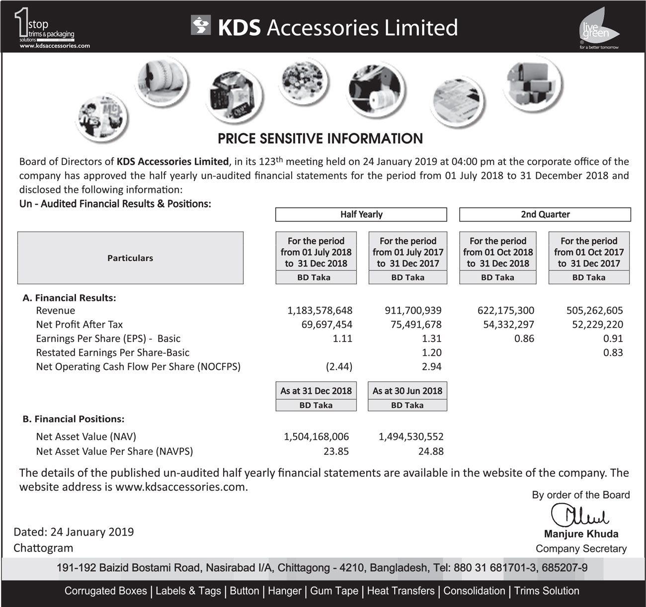 Price Sensitive Information of KDS Accessories Limited