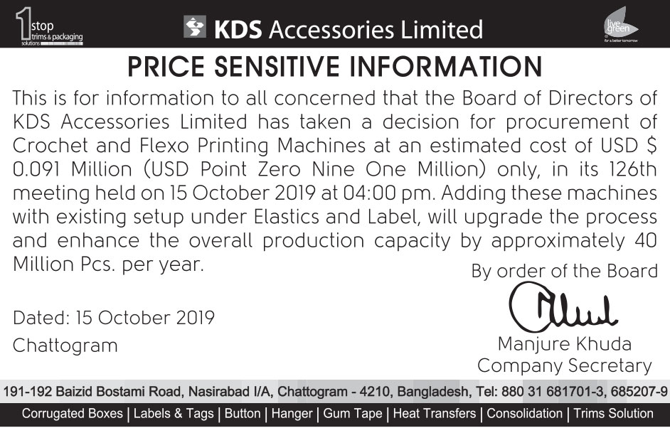 Price Sensitive Information of KDS Accessories Limited