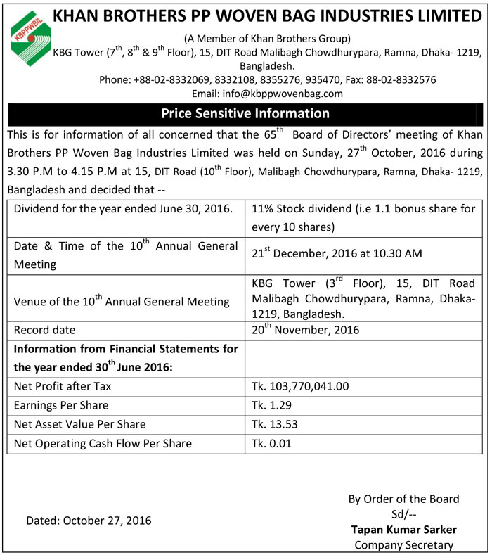 Price Sensitive Information of Khan Brothers PP Woven Bag Industries Ltd.