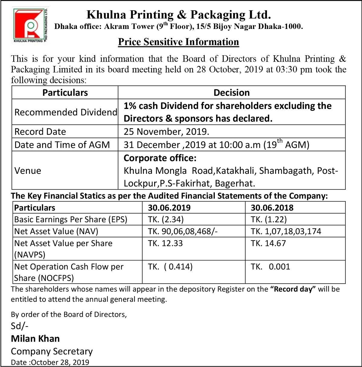 Price Sensitive Information of Khulna Printing & Packaging Limited