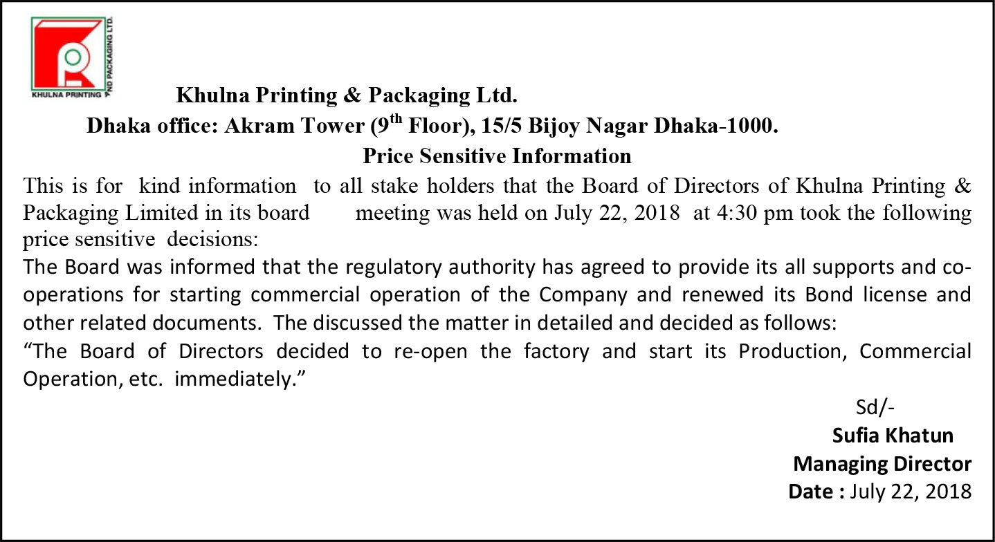 Price Sensitive Information of Khulna Printing & Packaging Limited
