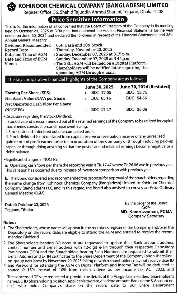 Price Sensitive Information of Kohinoor Chemical Company (Bangladesh) Limited
