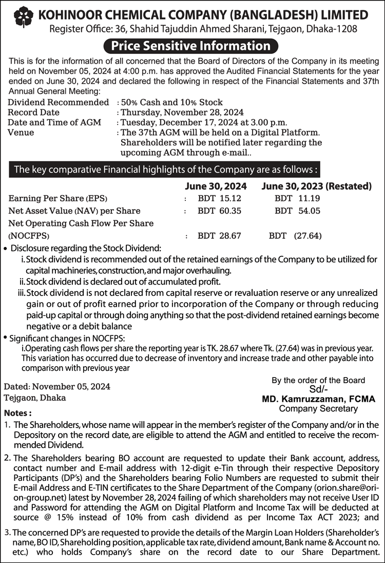 Price Sensitive Information of Kohinoor Chemical Company (Bangladesh) Limited