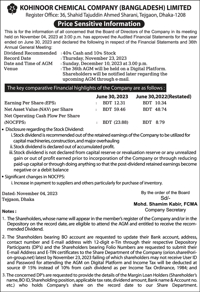 Price Sensitive Information of Kohinoor Chemical Company (Bangladesh) Limited